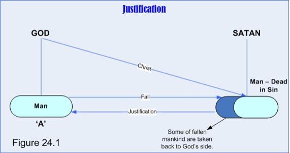 Back in Article 22 DeBrès had discussed the justification of fallen man. In the fall into sin all mankind had rejected God and joined the devil‘s side. As slaves of the devil, fallen man was dead in sin and reflected what the devil was like. In mercy the Lord God chose a certain number of fallen mankind to salvation in Christ, and so delivered them from bondage to Satan and restored them to God‘s side (see Figure 24.1). Though God was fully aware of their sins, God declared these sinners Not Guilty, righteous, for Christ‘s sake, so that these elect enjoy peace with God. This was justification.