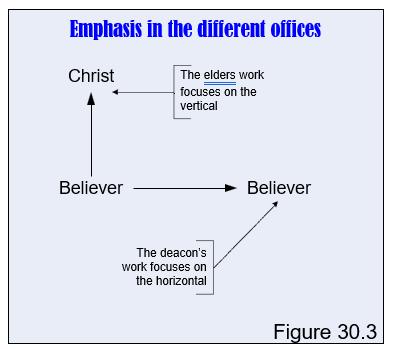 NOTE: it is to be understood that the scheme of Figure 30.3 is not to be understood in absolute terms. A problem between believers (on the horizontal plane) surely has a spiritual dimension (involving the elders). And a warped relation between a congregation member and God (vertical dimension) will affect that member‘s attitude and conduct toward his fellow member (horizontal dimension). Nevertheless, this scheme does make clear where the accents of the tasks of the respective offices lie.